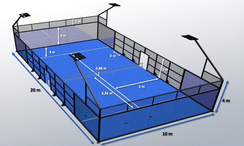 The 20m x 10m court is divided by a net and enclosed with glass walls and metal fences.